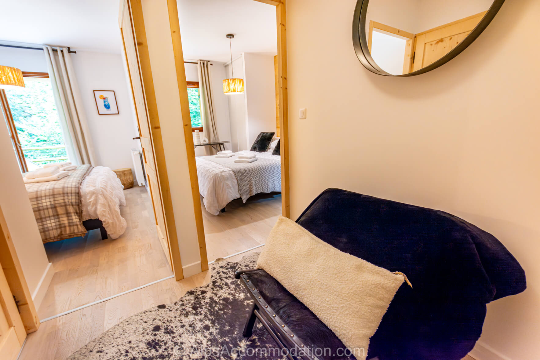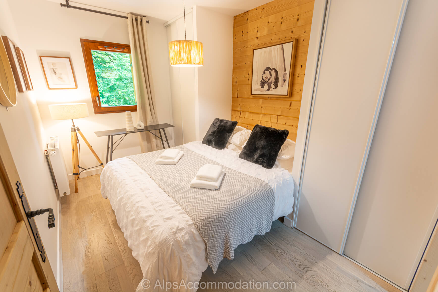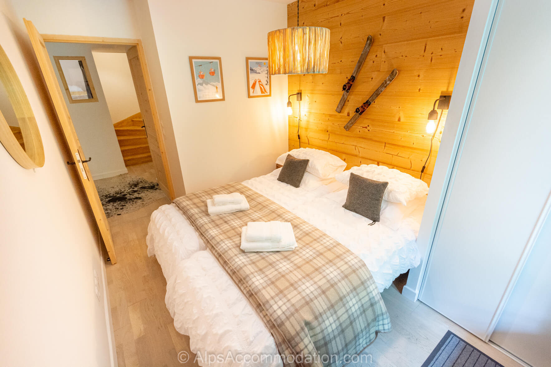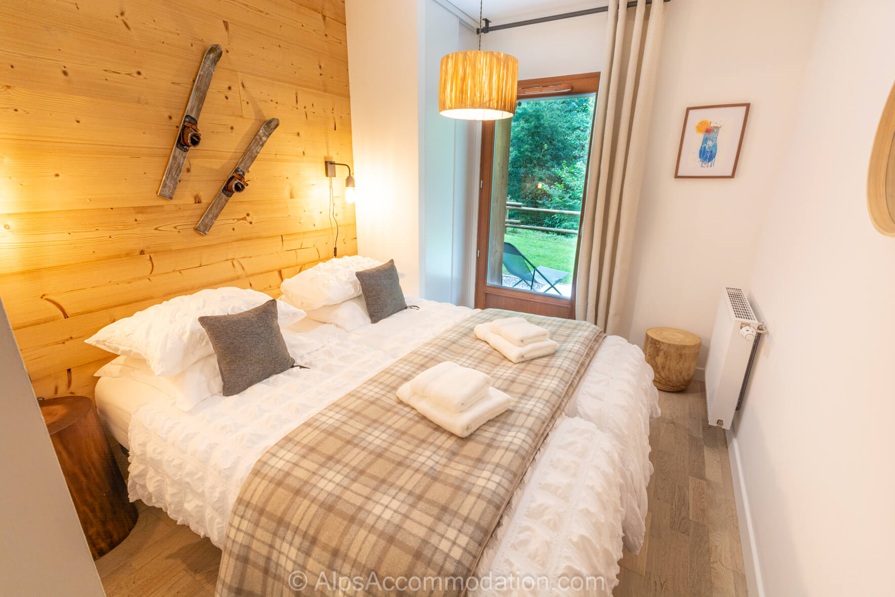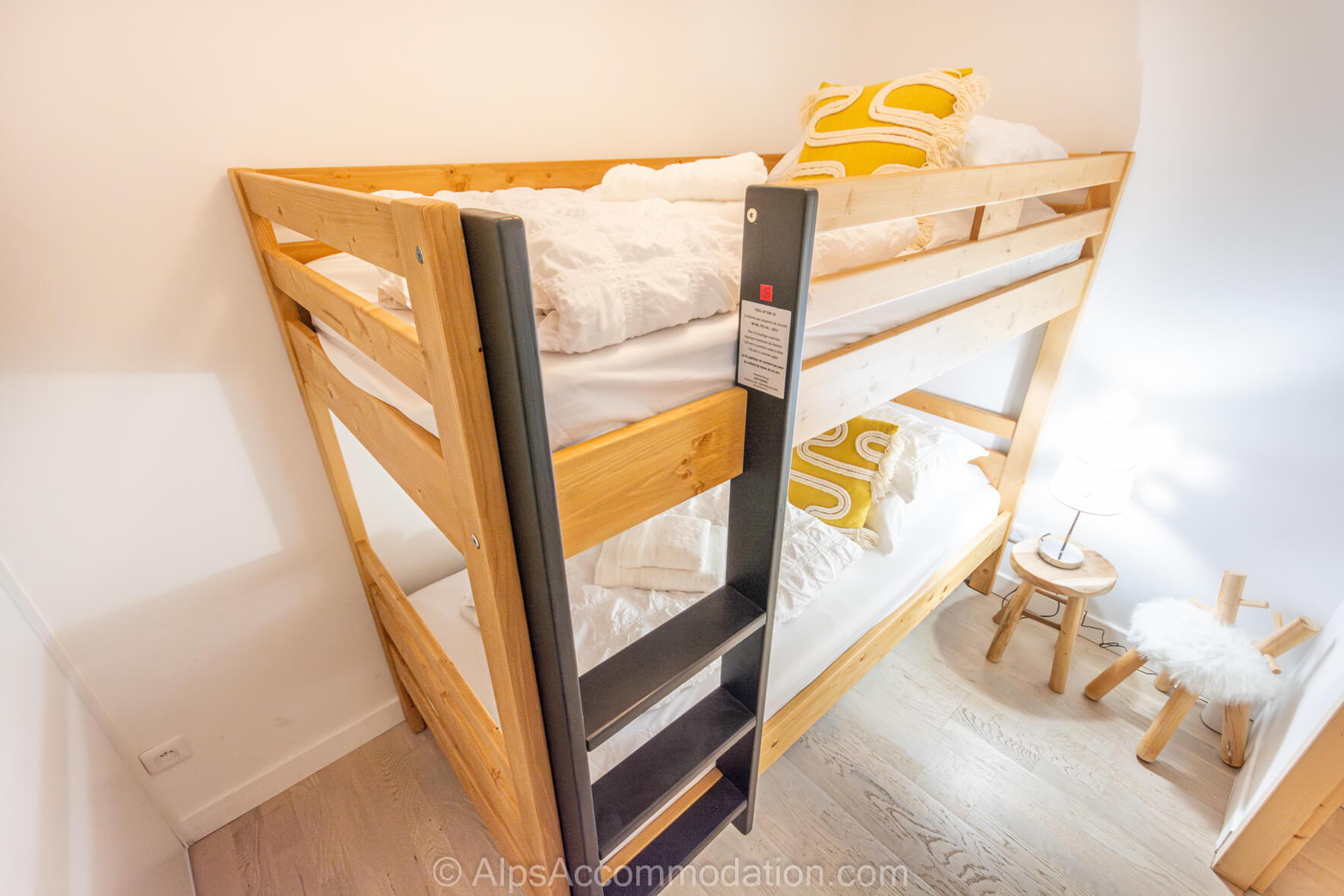 La chambre 3, décorée dans un charmant style montagnard, comprend aussi un lit super king-size (pouvant être configuré en lits jumeaux sur demande) et une armoire spacieuse, avec un accès direct aux jardins par une terrasse privée - un endroit idéal pour prendre un café le matin. Située en face, la chambre quatre est une chambre avec lits superposés confortable, idéale pour les enfants comme pour les adultes.