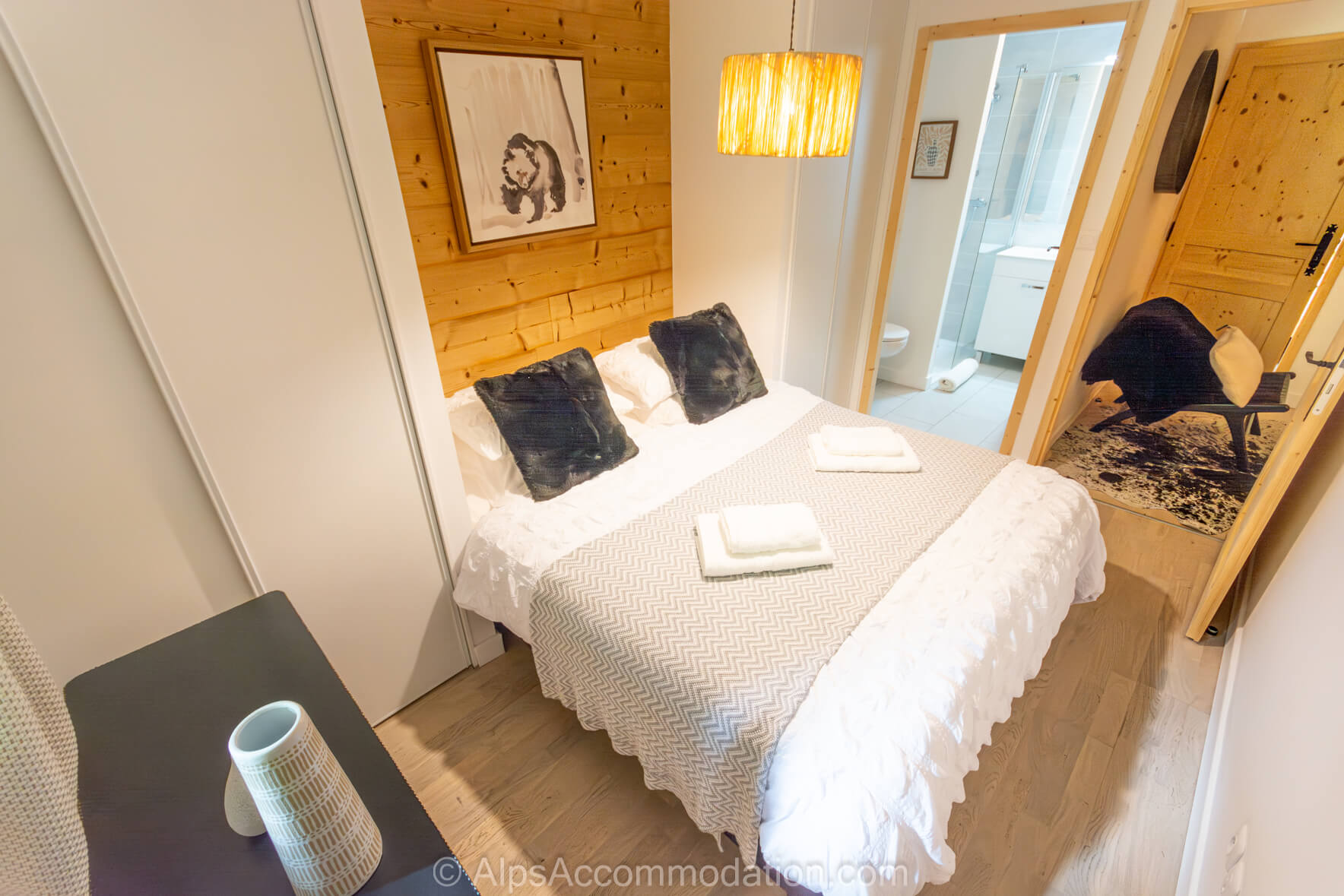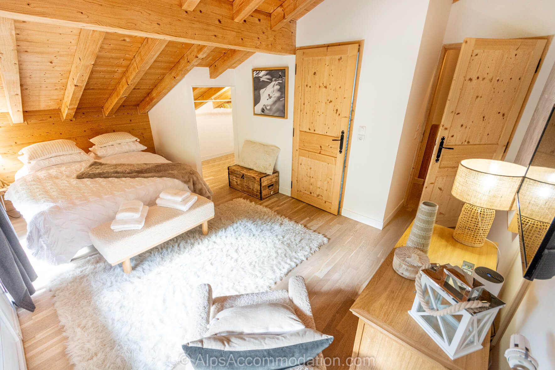 La chambre 1, chambre principale située au niveau supérieur, est un véritable sanctuaire doté d'un opulent lit super king-size, d'une salle de bain attenante, d'une télévision et d'un dressing. De grandes fenêtres s'ouvrent sur le balcon, permettant aux hôtes de se réveiller avec une vue imprenable sur la forêt, et renforçant l'ambiance lumineuse et aérée. La salle de bain attenante est équipée d'une douche et d'un meuble-lavabo.