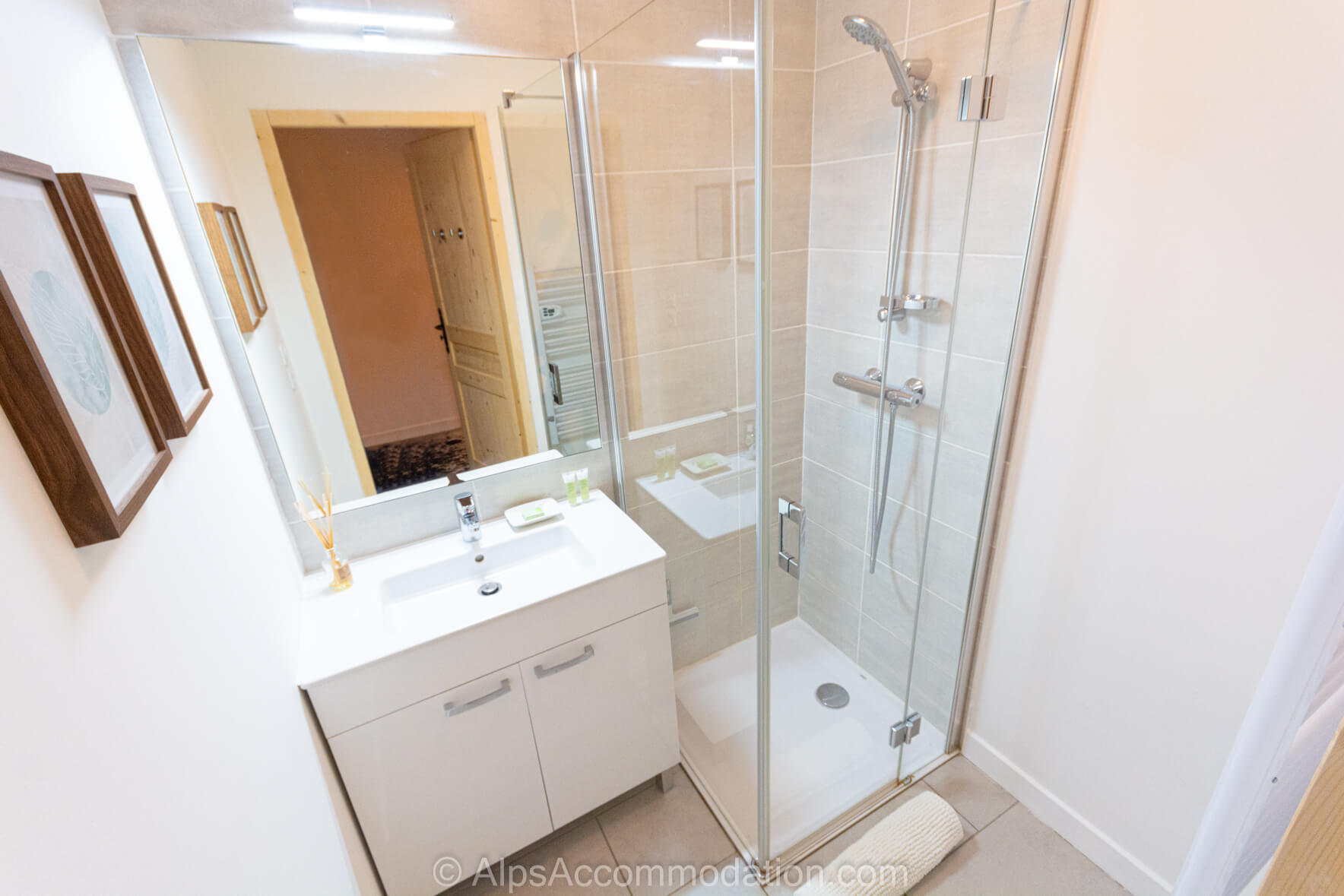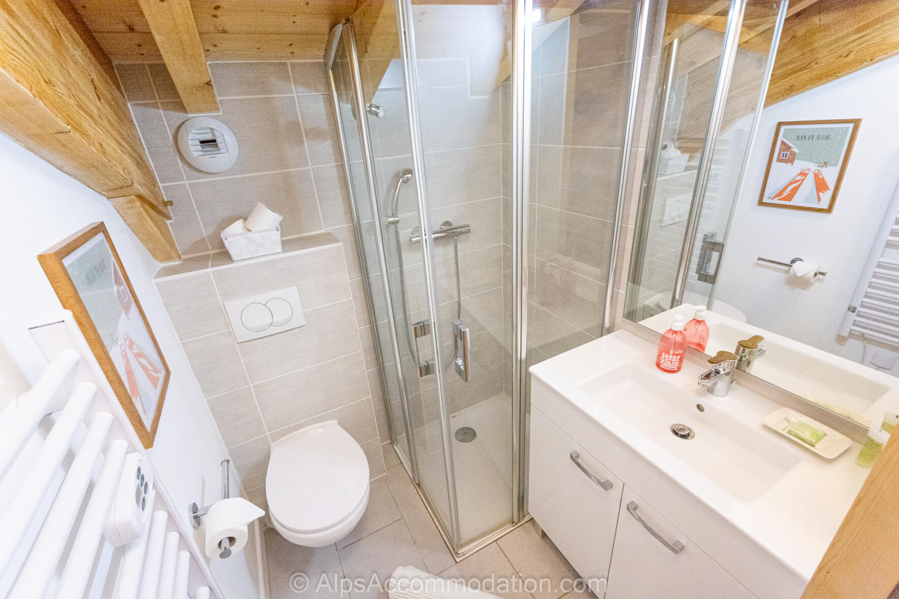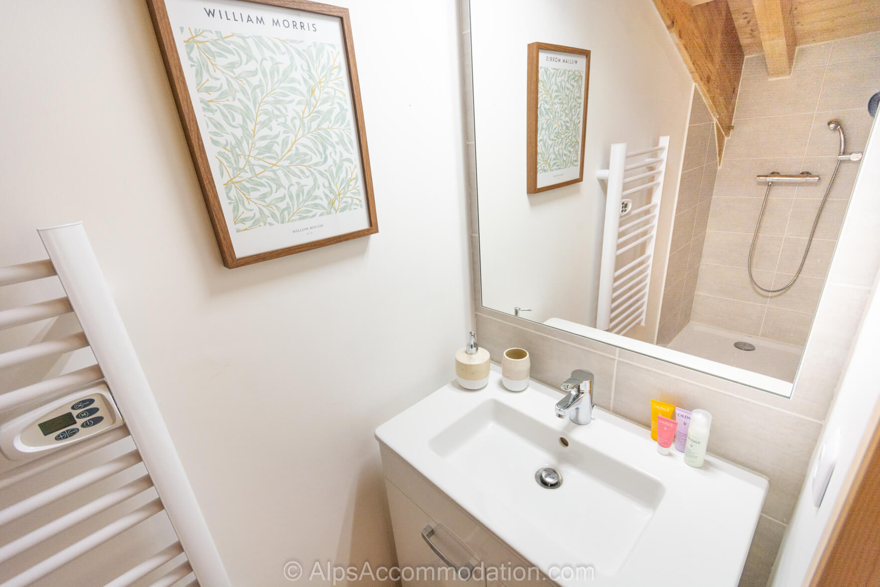 Les chambres trois et quatre partagent une salle de bain familiale au même étage, avec une douche, un meuble-lavabo, un radiateur sèche-serviettes et un WC.