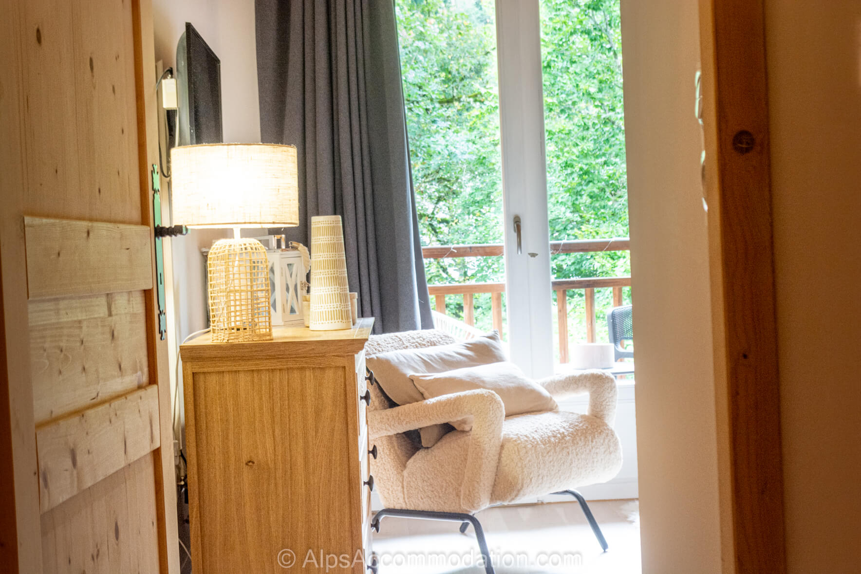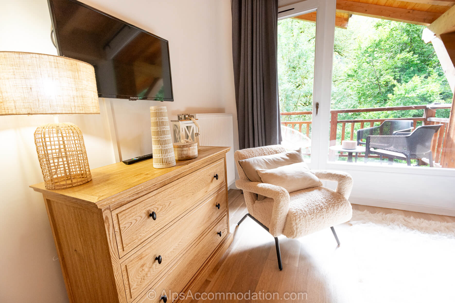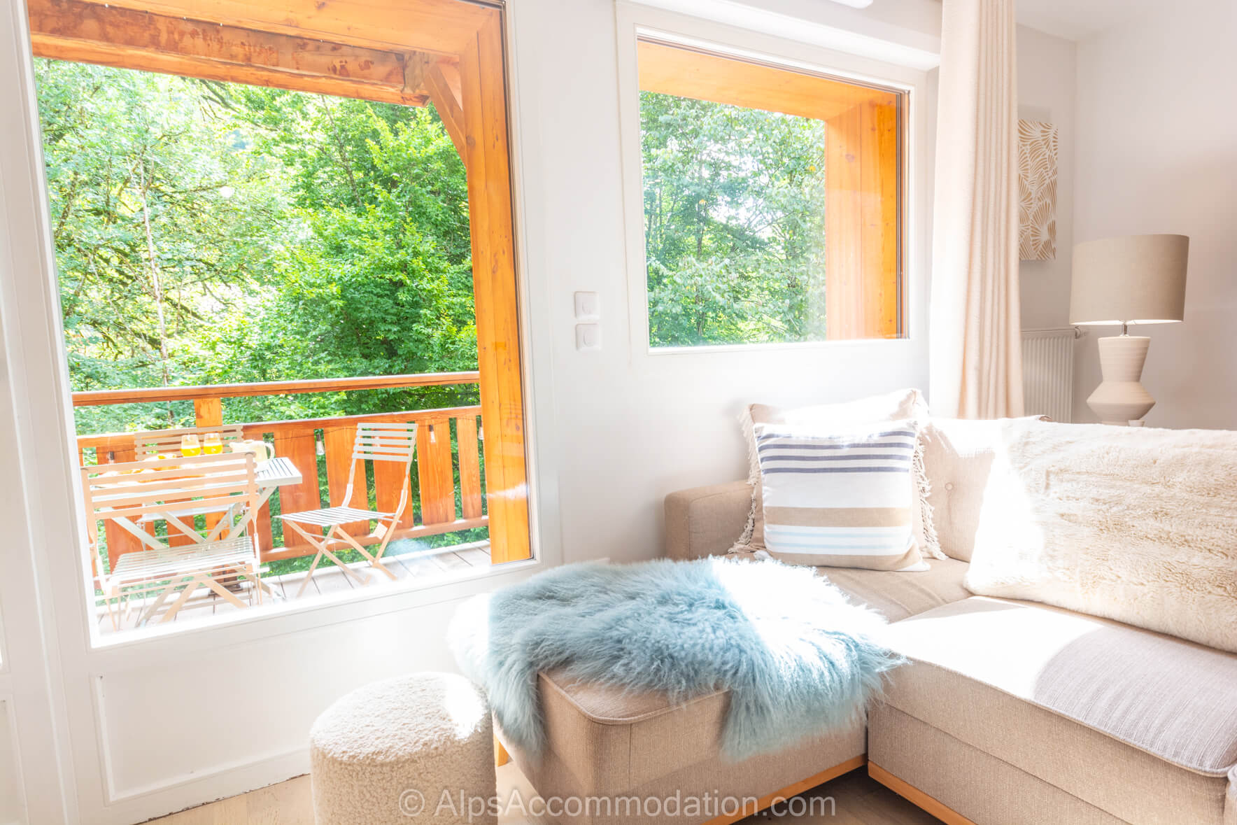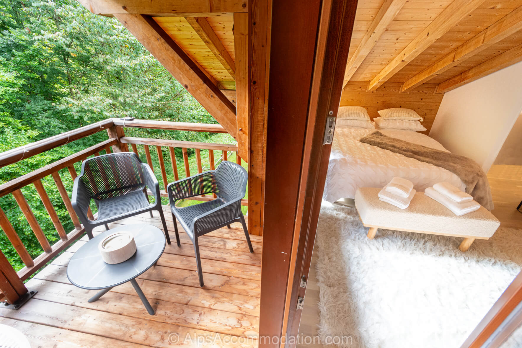 Les deux grands balcons du chalet, orientés vers l'est et répartis entre le niveau intermédiaire et le niveau supérieur, totalisent 10 m² et offrent des vues spectaculaires sur les forêts verdoyantes en été et sur les arbres recouverts de leur manteau de neige en hiver. Au sud, on aperçoit le village de Samoëns et l'impressionnante cascade du Nant d'Ant. Le balcon le plus bas est équipé d'une table et de chaises, tandis que des fauteuils confortables invitent à la détente.