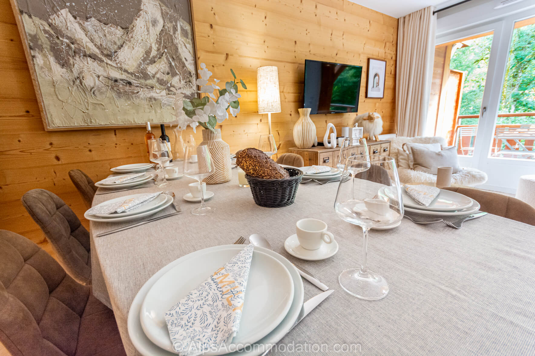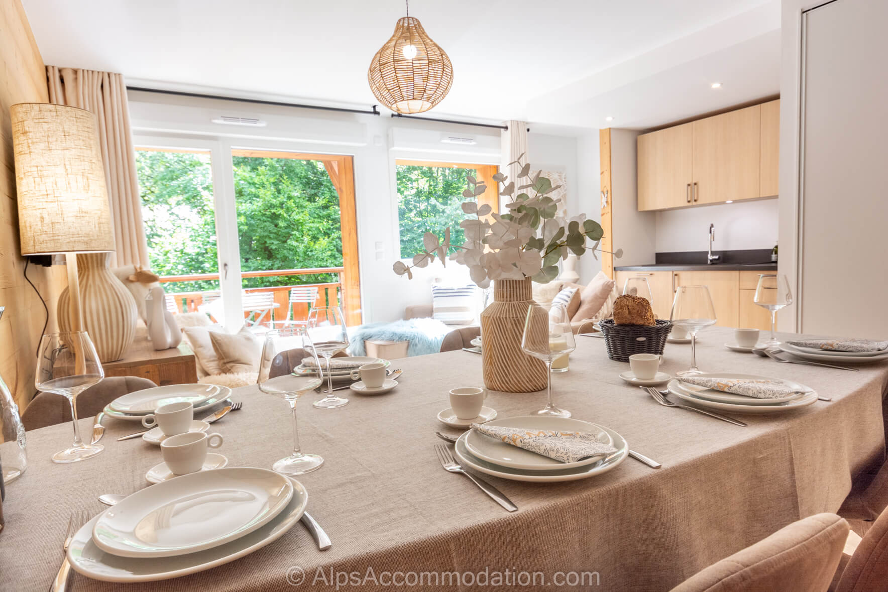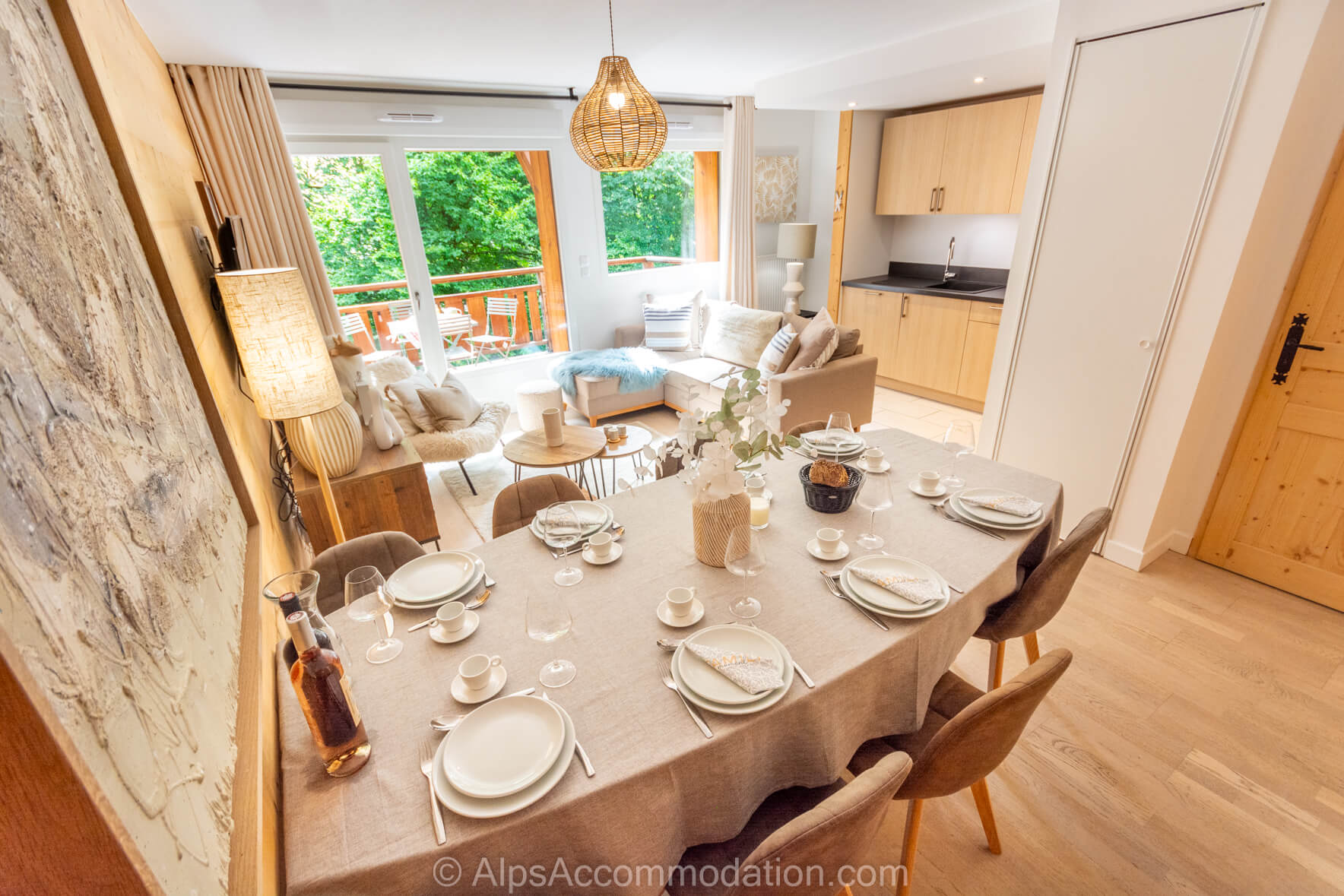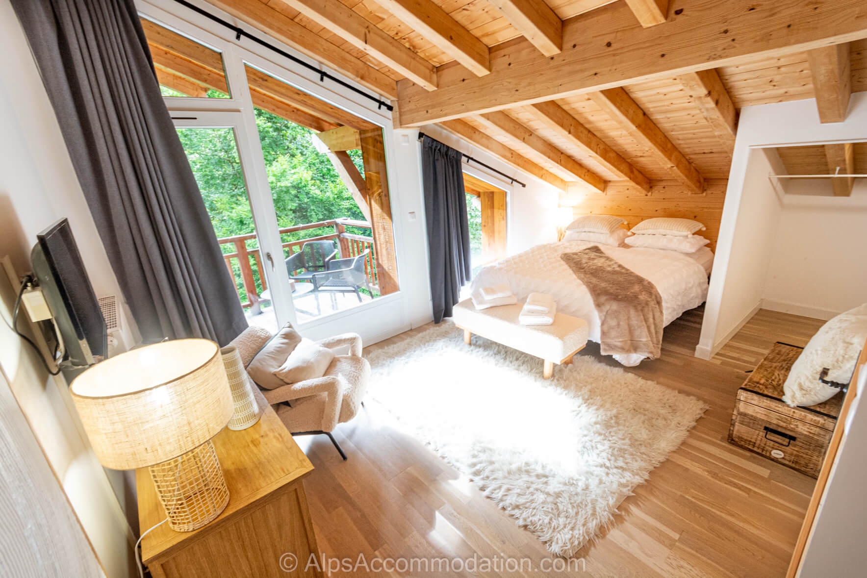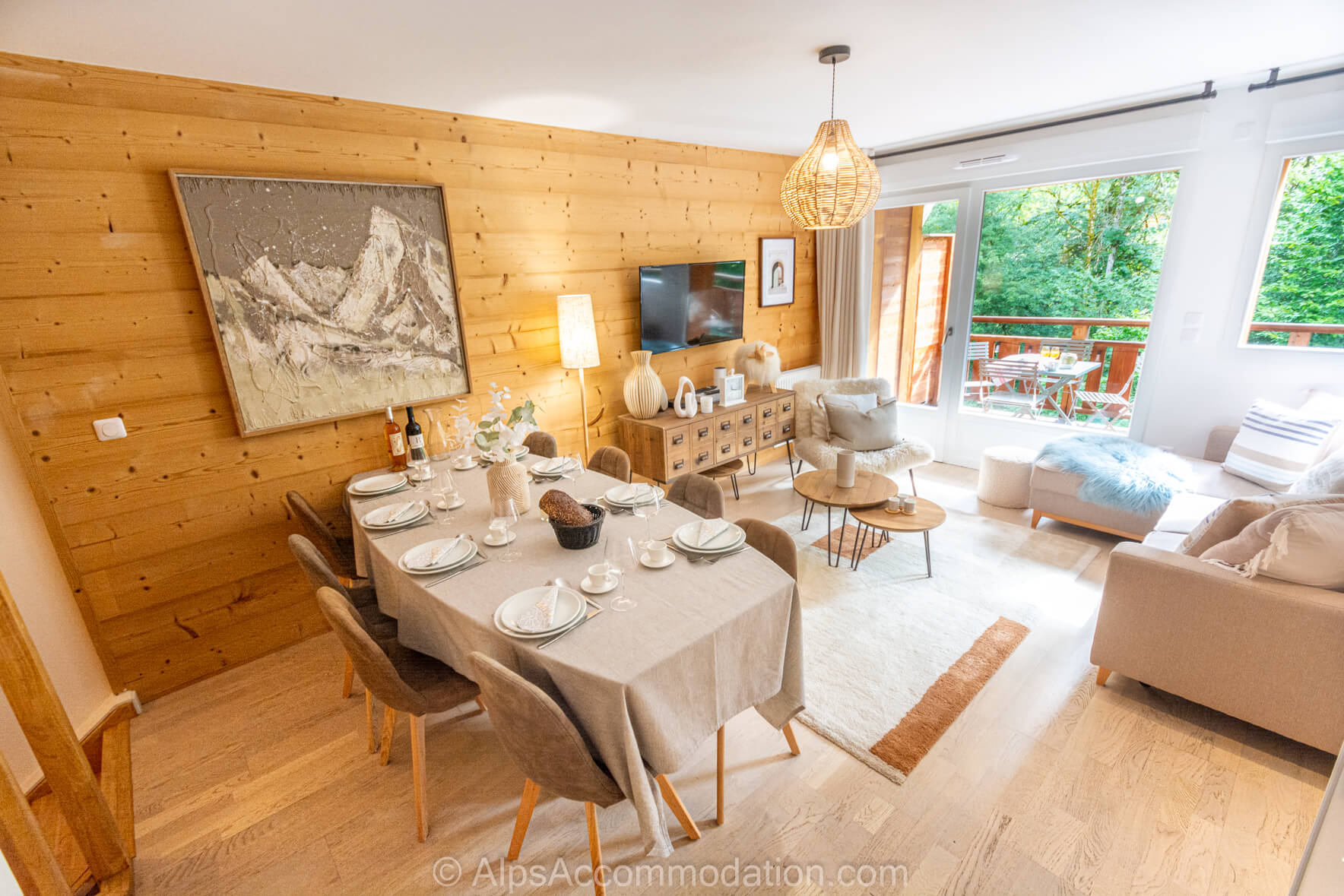 Les deux grands balcons du chalet, orientés vers l'est et répartis entre le niveau intermédiaire et le niveau supérieur, totalisent 10 m² et offrent des vues spectaculaires sur les forêts verdoyantes en été et sur les arbres recouverts de leur manteau de neige en hiver. Au sud, on aperçoit le village de Samoëns et l'impressionnante cascade du Nant d'Ant. Le balcon le plus bas est équipé d'une table et de chaises, tandis que des fauteuils confortables invitent à la détente.