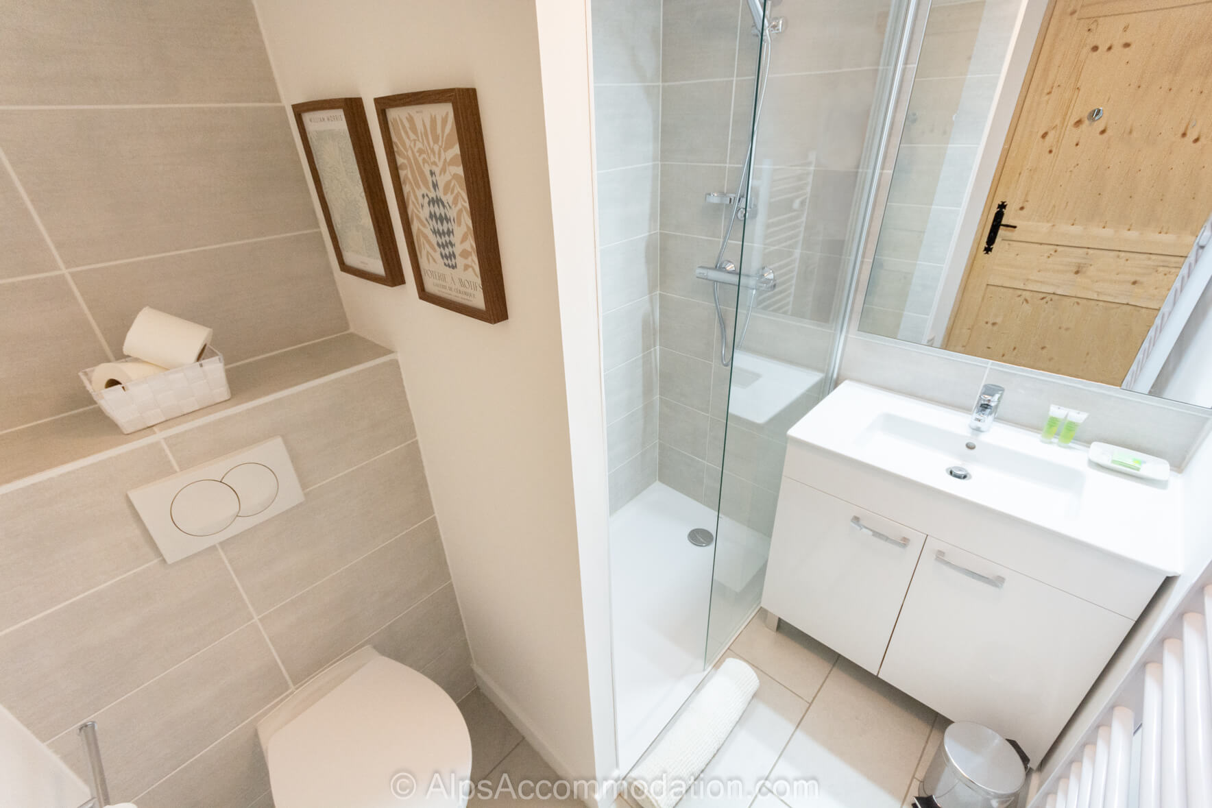 Au niveau intermédiaire, une cinquième salle de bain est équipée d'une douche avec accès PMR et WC.