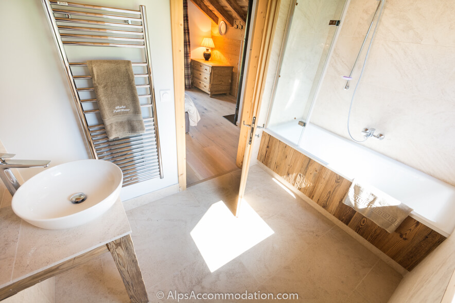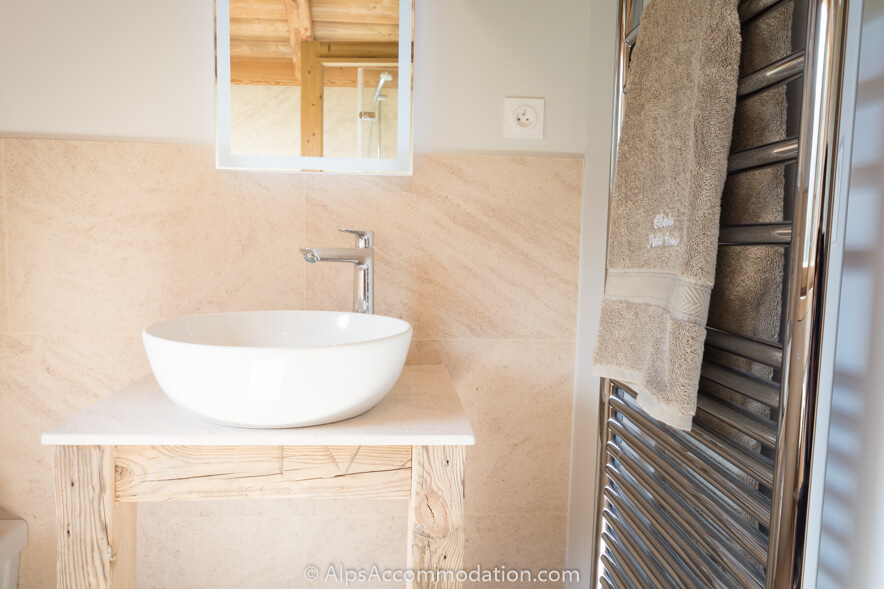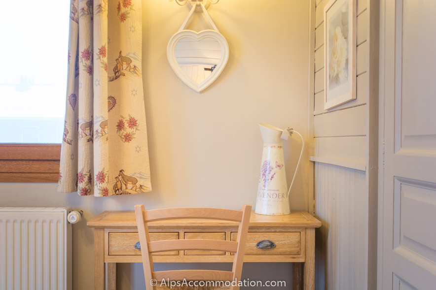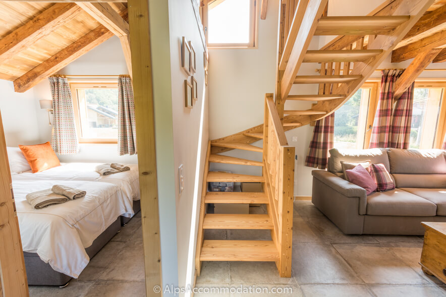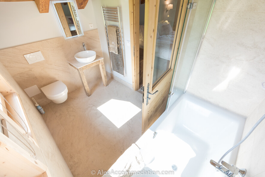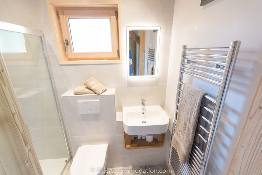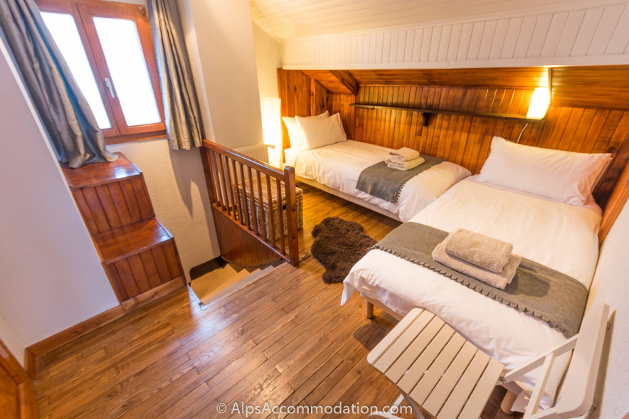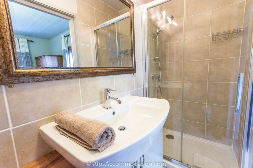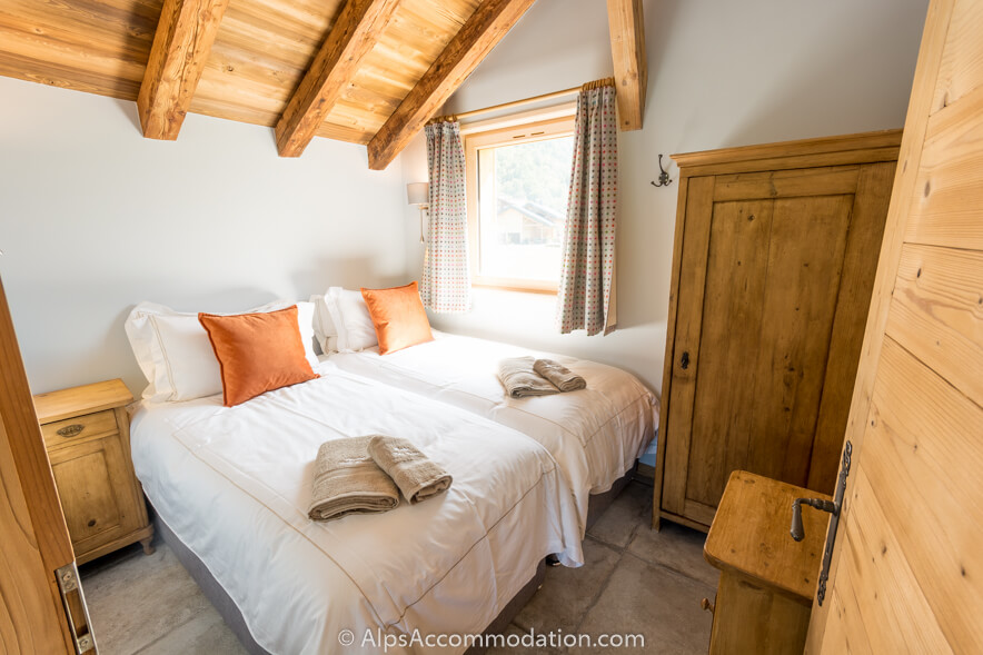 La chambre 7 est située au niveau inférieur du chalet, une pièce lumineuse et spacieuse, qui offre des vues superbes sur les champs agricoles et les impressionnants pics qui surplombent Sixt-Fer-à-Cheval. La pièce est équipée de deux lits simples qui peuvent cependant être arrangés en lit double Super-king sur demande. Du rangement est disponible grâce à l’armoire en bois et la commode. Cette chambre a accès à une salle de bain familiale, également située à l’étage inférieur, équipée d’une large douche, d’un lavabo avec miroir à lumière LED anti-condensation, et WC.