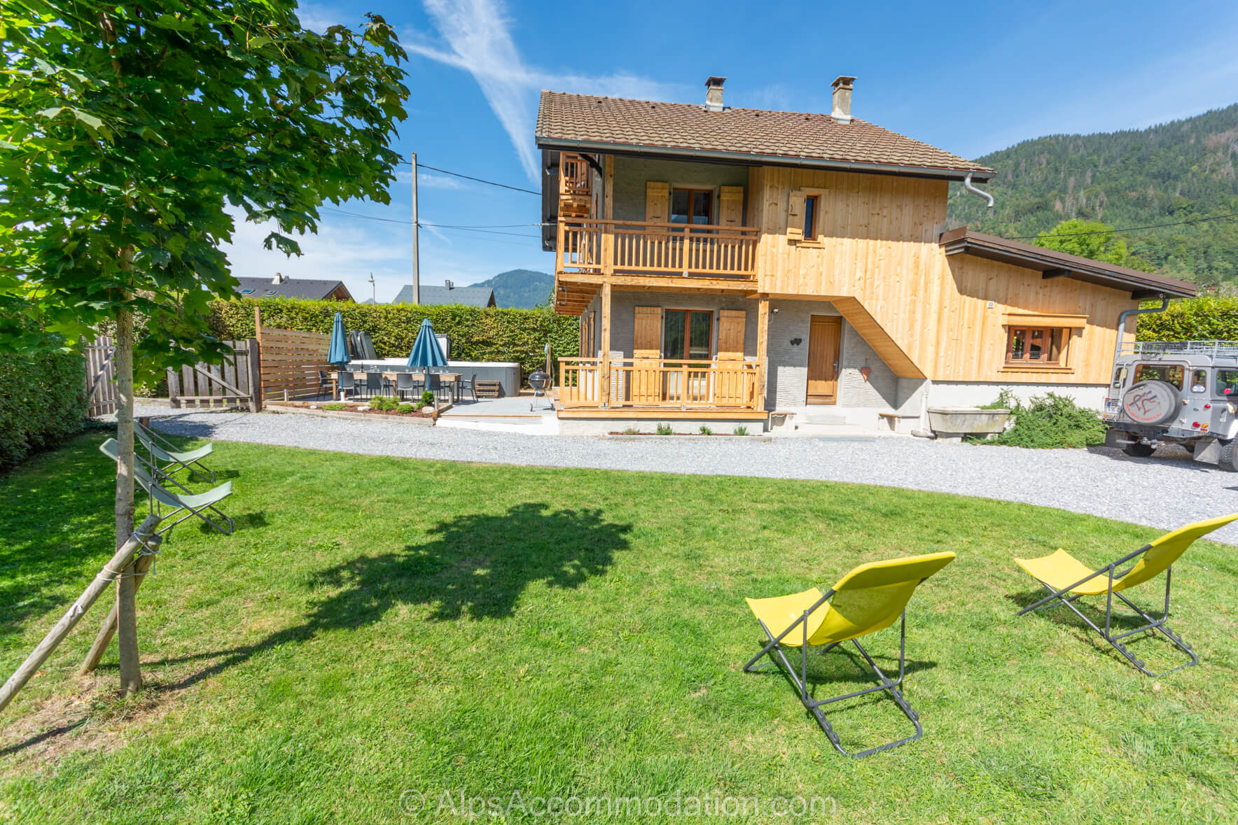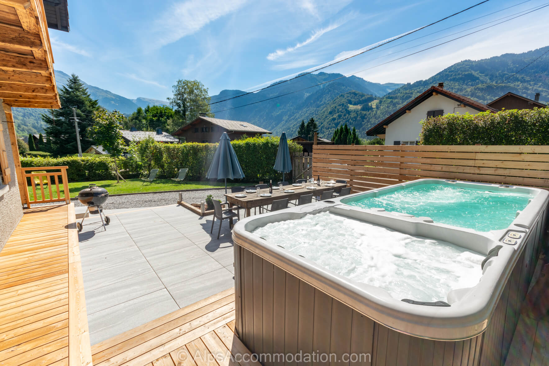 Une terrasse surélevée à l’avant du chalet entoure un spa et un spa de nage (inclus toute l’année). Sur le côté et à l’arrière des chalets se trouvent deux espaces gazonnés dont vous pourrez profiter été comme hiver.