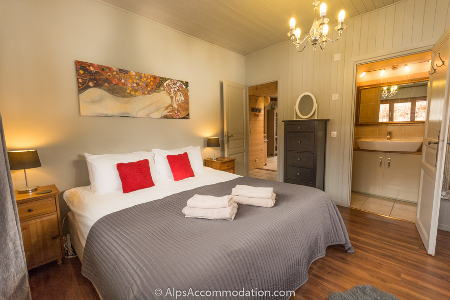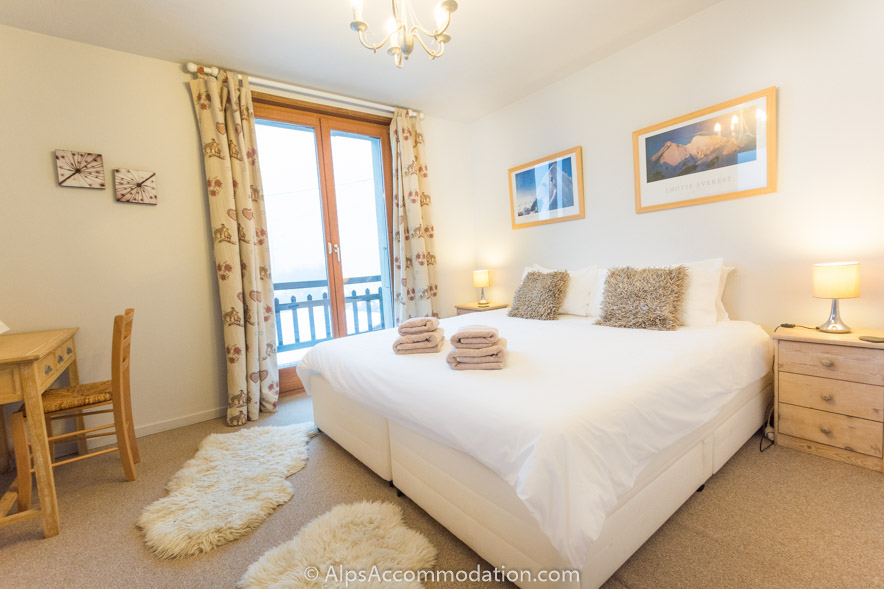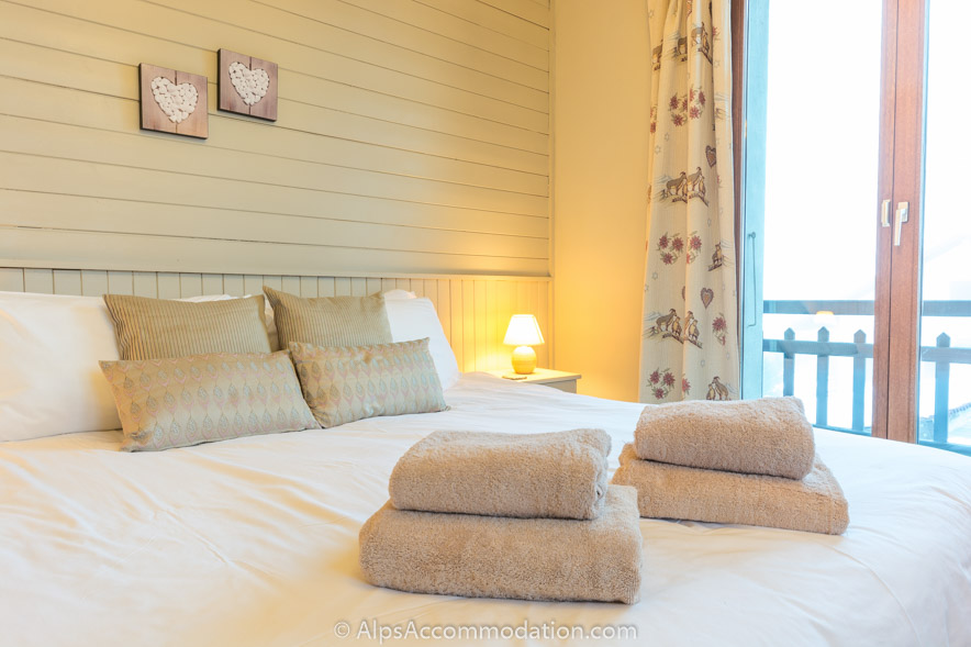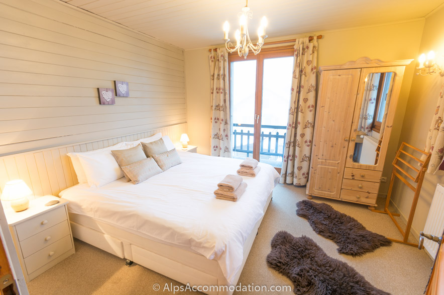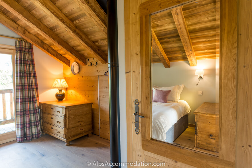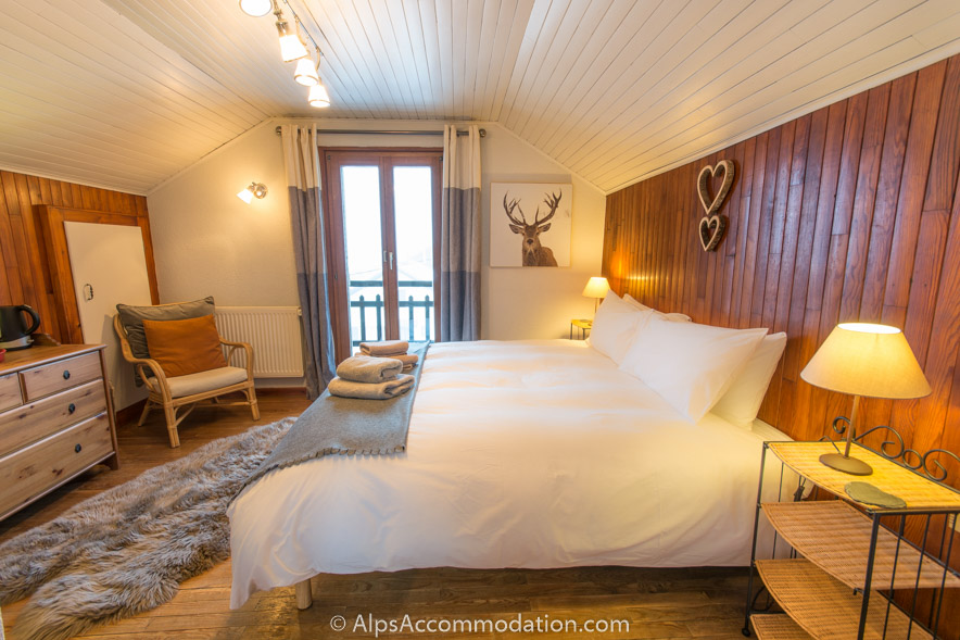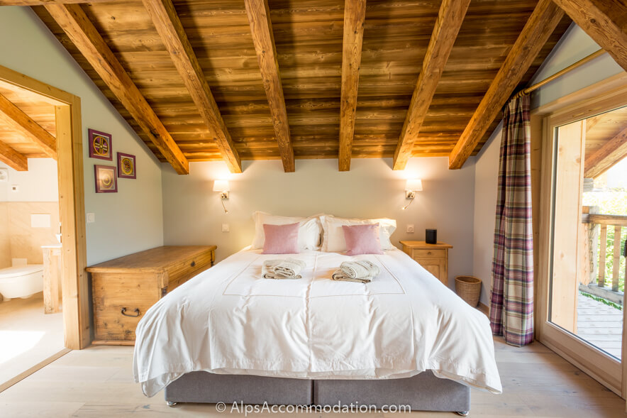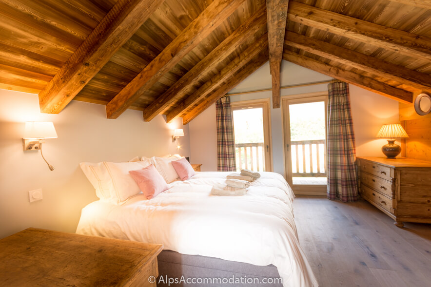La chambre principale de Chalet Petit Cœur est dotée d’un balcon privé qui donne vue sur les jardins.
