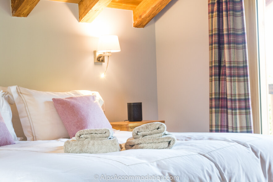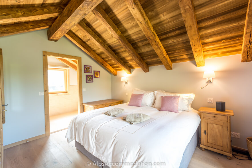 Les deux dernières chambres se trouvent dans Chalet Petit Cœur. Chambre 6, l’impressionnante suite principale, occupe la totalité de l’étage supérieur du chalet. Dotée de belles poutres apparentes, elle offre des vues imprenables sur les jardins de son balcon privé. La spacieuse salle de bain comprend une grande baignoire avec douche intégrée, un lavabo avec miroir à lumière LED anti-condensation, et WC. Un ample espace de rangement est prévu grâce à la commode et la penderie. Une enceinte Sonos et le lit Super-King ajoutent une touche de luxe.