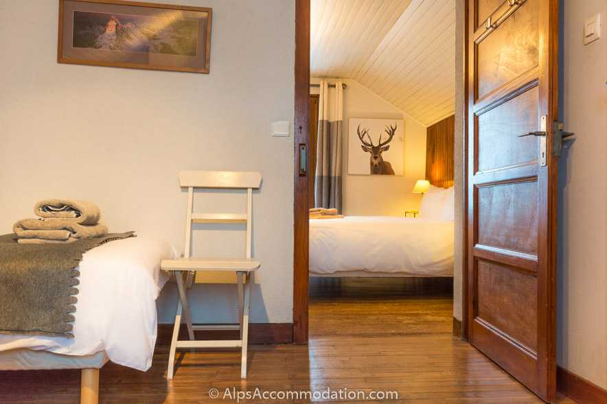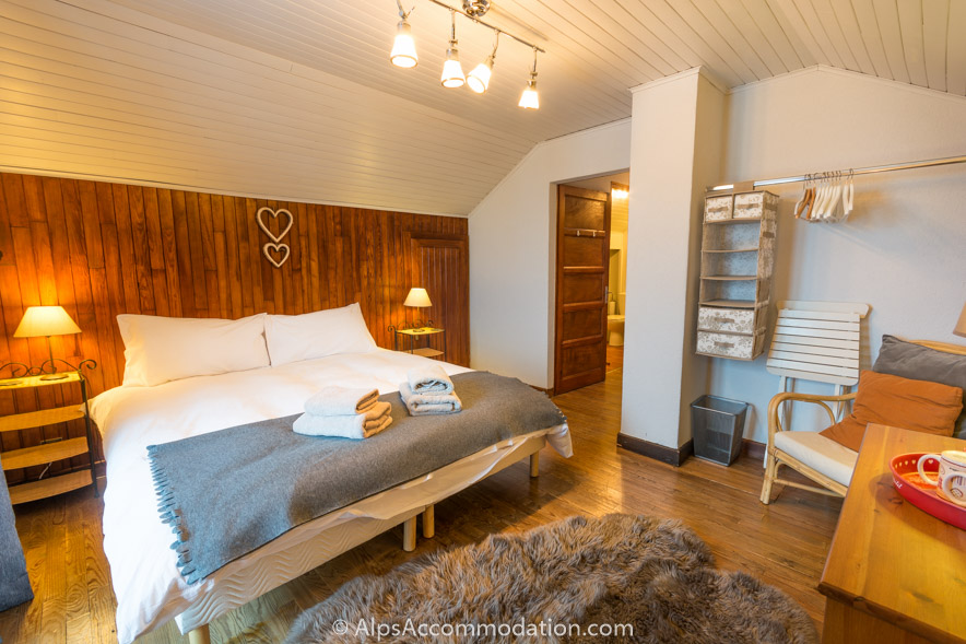 Maison Deux Cœurs abrite les 5 premières chambres. Chambre 1 est au niveau de l’entrée, une spacieuse chambre à lit double king-size avec sa suite salle de bain équipée d’une douche, d’un lavabo et WC. Une salle de bain supplémentaire est disponible à cet étage, comprenant également douche, lavabo et WC. Au premier étage se trouvent 3 chambres – 2 doubles à lits king-size qui peuvent également être aménagées en lits jumeaux, chacune avec son propre balcon. La troisième chambre à ce niveau dispose des lits superposés de taille normale. Une salle de bain familiale est située à cet étage, elle est équipée d’une baignoire, d’une douche, d’un lavabo et WC. Un WC supplémentaire se trouve à ce niveau. Des escaliers mènent à la chambre 5 dans les combles du chalet, elle peut être configurée avec lit king-size ou lits jumeaux, et offre de jolies vues de son balcon. L’accès à cette chambre se fait via une chambre mezzanine à 2 lits simples. La chambre 5 dispose d’une salle de bain avec douche, lavabo et WC.