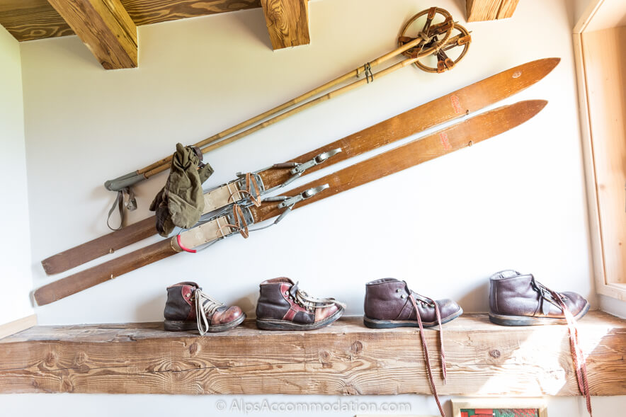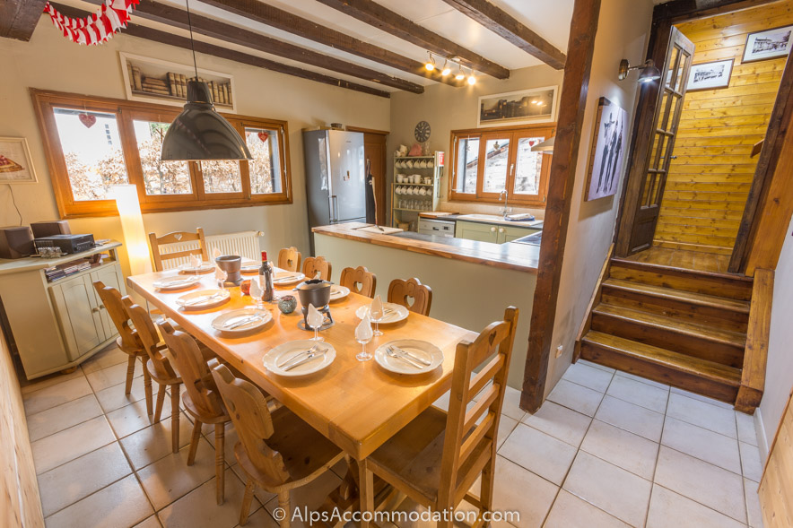 L’espace salle à manger se situe face à de grandes baies vitrées coulissantes qui mènent à la terrasse et aux jardins, et apportent à tout le rez-de-chaussée du chalet une sensation d’espace et de luminosité. Une table en bois peut accueillir jusqu’à 6 convives en tout confort, tandis qu’une charmante lampe suspendue faite d’anciens skis vous rappellera que vous êtes bien en vacances dans les Alpes !