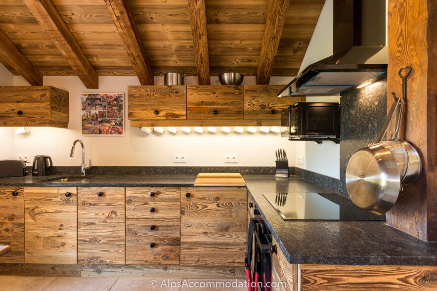La cuisine, extrêmement spacieuse & associant vieux bois et plans de travail en granite avec succès, vient tout-équipée, et comprend en l’occurrence un four électrique à chaleur tournante, un lave-vaisselle, et un four à micro-ondes. Elle a été conçue astucieusement afin d’optimiser au maximum les espaces de rangement et surfaces de travail.