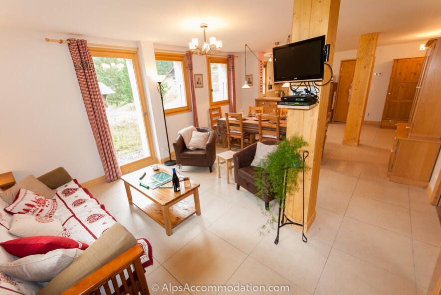 L’entrée privé de l’appartement est situé au premier niveau du chalet et au deuxième se trouve l’appartement des propriétaires – un couple charmant, et bien informés de toutes les activités de l’hiver et de l’été, du région. Donc, nos clients ont une expérience idéale: des vacances tranquilles, mais avec, à deux pas, les informations du village, des activités et services. Près du pied de la piste de ski fameuse La Cascade (direction du Flaine) et 400m des pistes pour débutants, l’appartement offre des vues extraordinaires des falaises et montagnes environnantes. Le bar de la piste est tout prêt et, au direction opposé, après une promenade courte, vous vous trouverez au centre village - et à tout proximité d’un petit epicerie, une boulangerie, et plusieurs commerçants, cafés et bars.