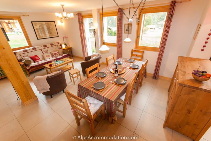 La cuisine, le séjour et la salle à manger, à plan ouvert, donnent un espace convivial et fantastique – en plus, il y a des vues panoramiques vers le jardin et, au fond, les montagnes. La cuisine, superbement equipée, vous offre de l’espace et des outils et équipéments à cuisiner des repas delicieux, après une journée à la montagne. L’espace salle à manger peut accueillir 8 personnes en tout confort.